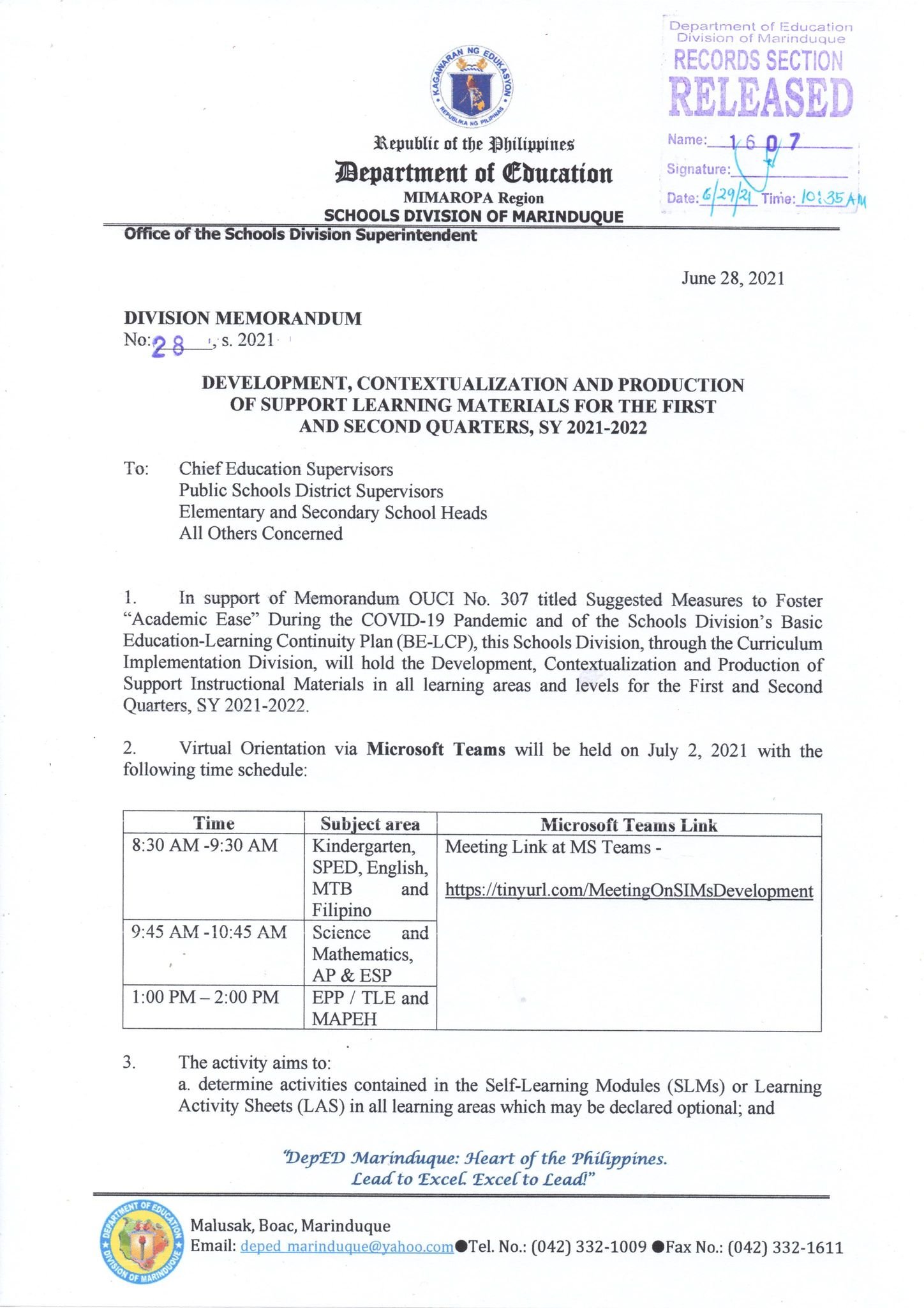 Jun 29, 2021 DIVISION MEMORANDUM NO. 28, S. 2021 DEVELOPMENT, CONTEXTUALIZATION AND PRODUCTION OF SUPPORT LEARNING MATERIALS FOR THE FIRST AND SECOND QUARTERS, SY 2021-2022