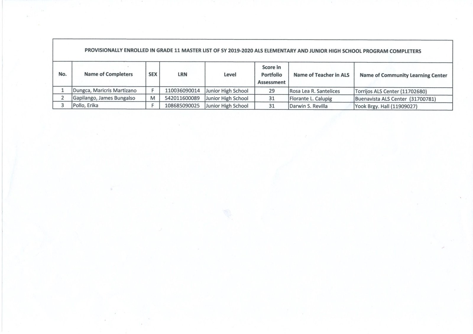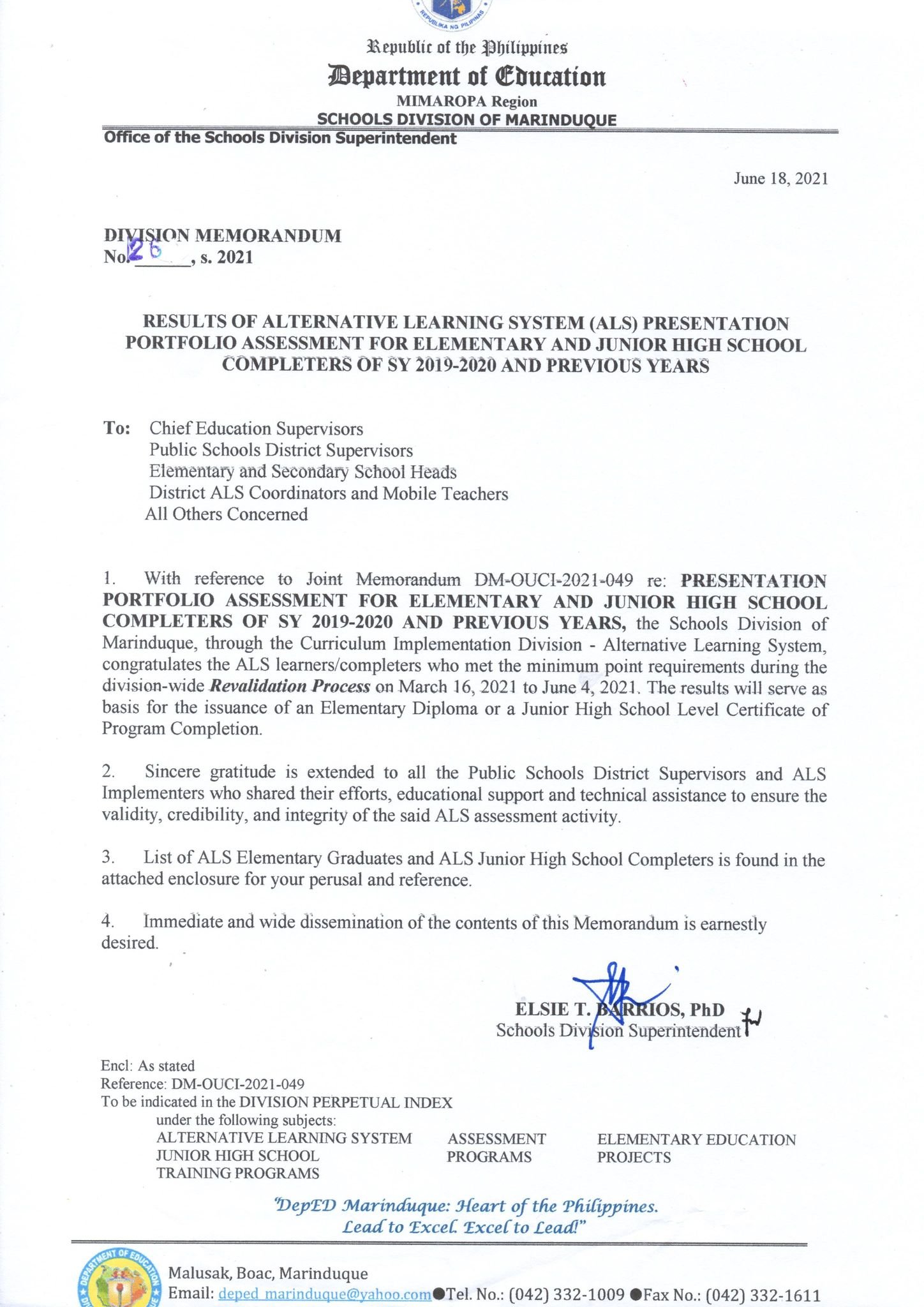 Jun 24, 2021 DIVISION MEMORANDUM NO.26, S.2021 RESULTS OF ALTERNATIVE LEARNING SYSTEM (ALS) PRESENTATION PORTFOLIO ASSESSMENT FOR ELEMENTARY AND JUNIOR HIGH SCHOOL COMPLETERS OF SY 2019-2020 AND PREVIOUS YEARS