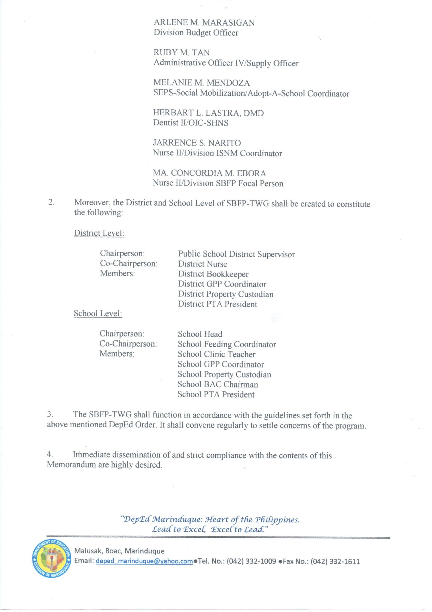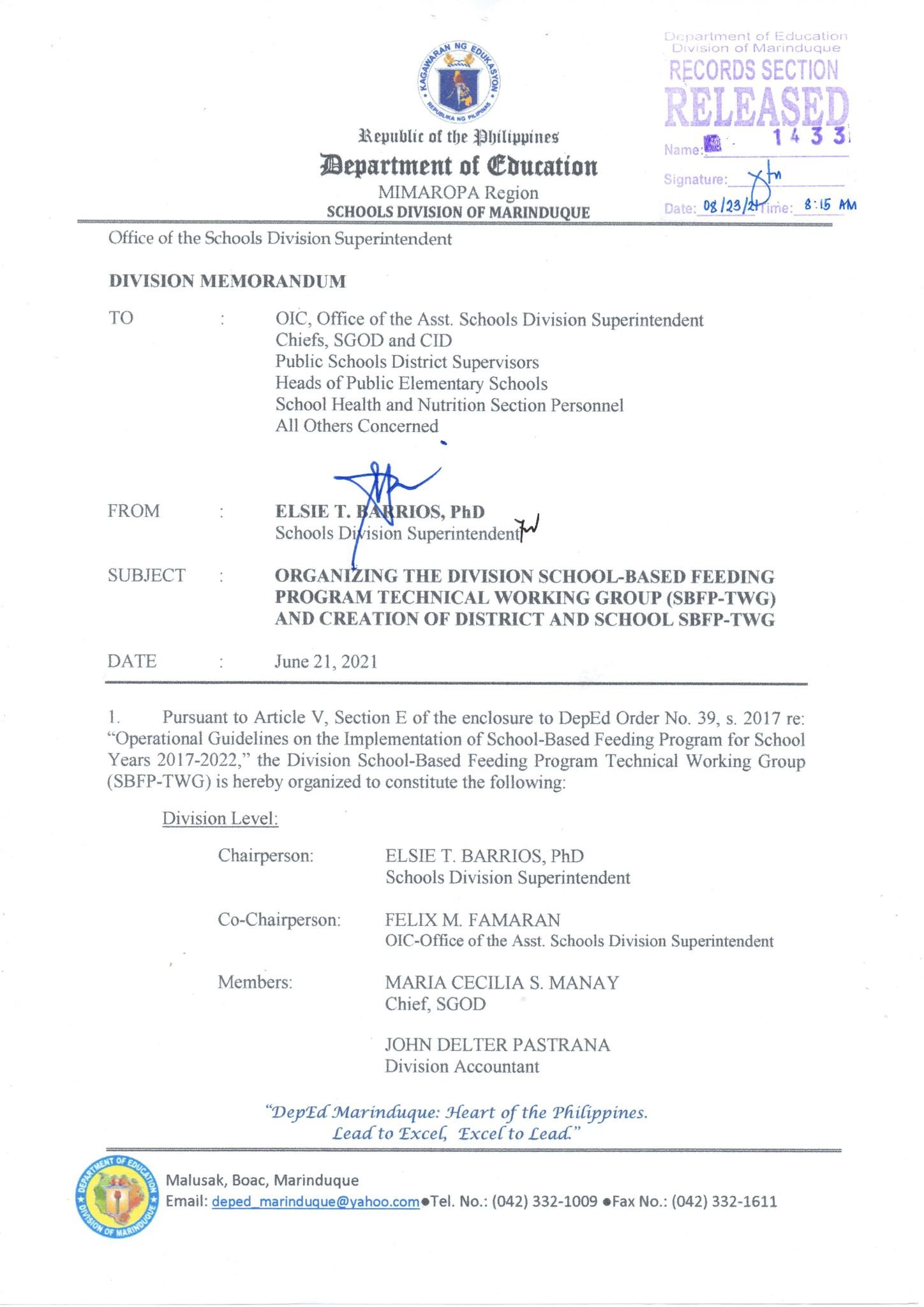 Jun 23, 2021 ORGANIZING THE DIVISION SCHOOL-BASED FEEDING PROGRAM TECHNICAL WORKING GROUP (SBFP-TWG) AND CREATION OF DISTRICT AND SCHOOL SBFP-TWG