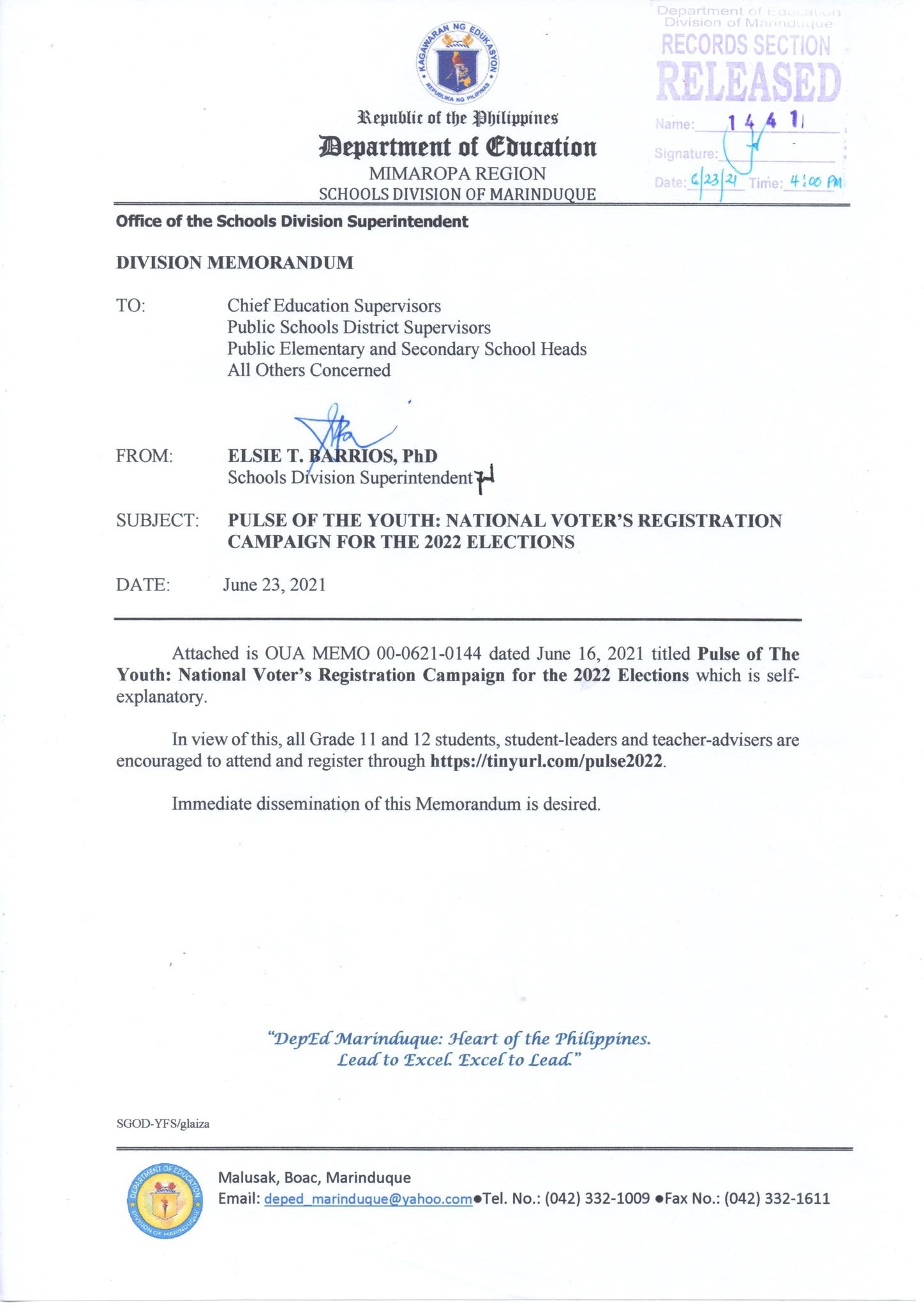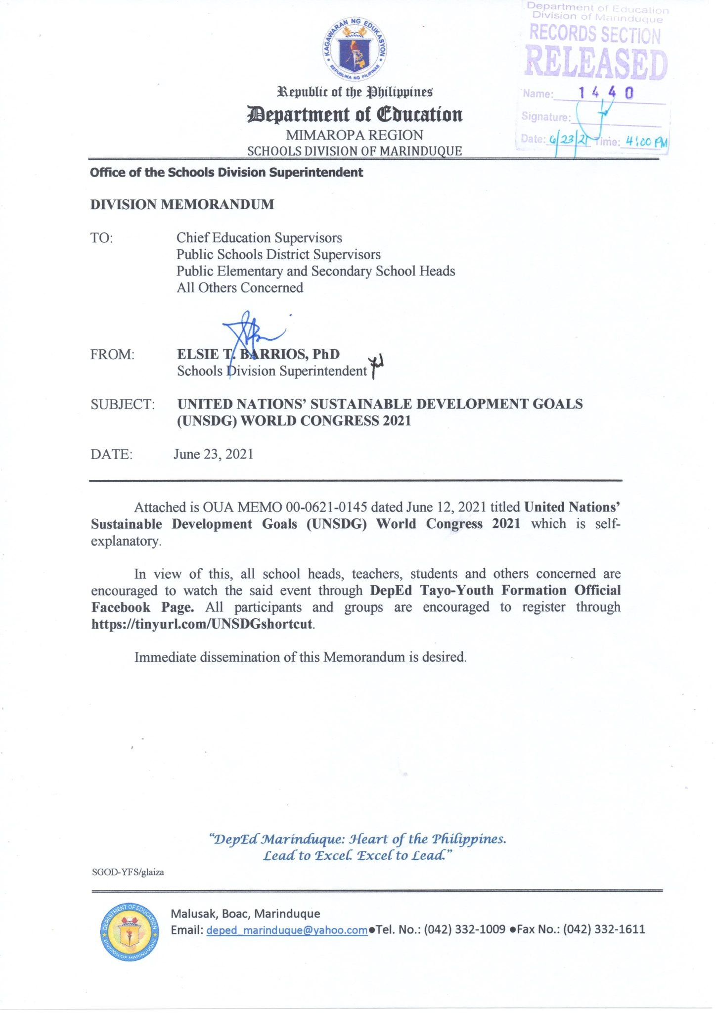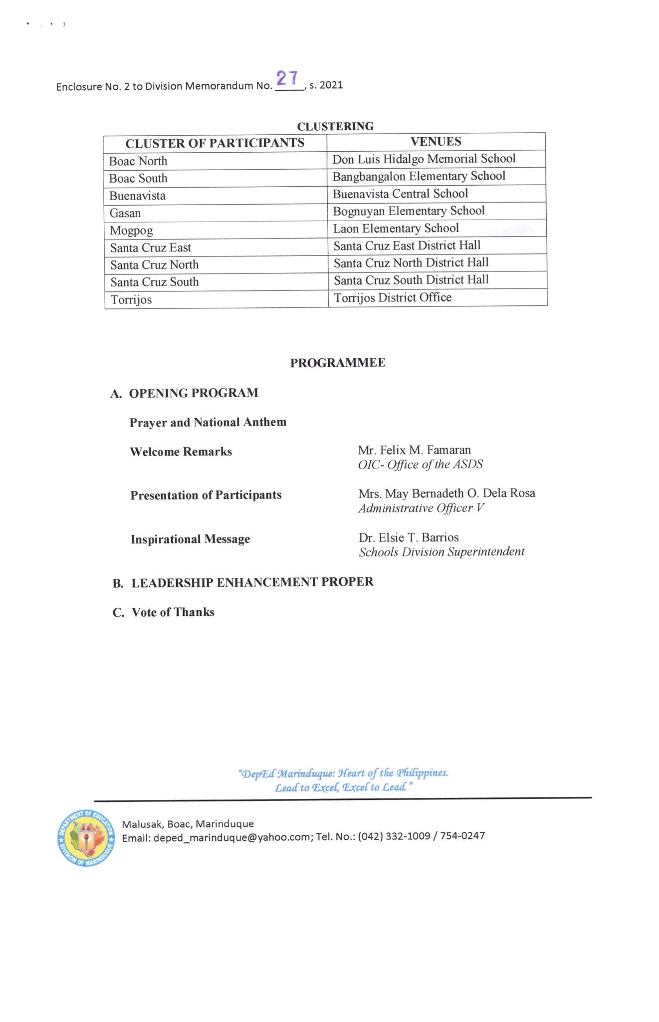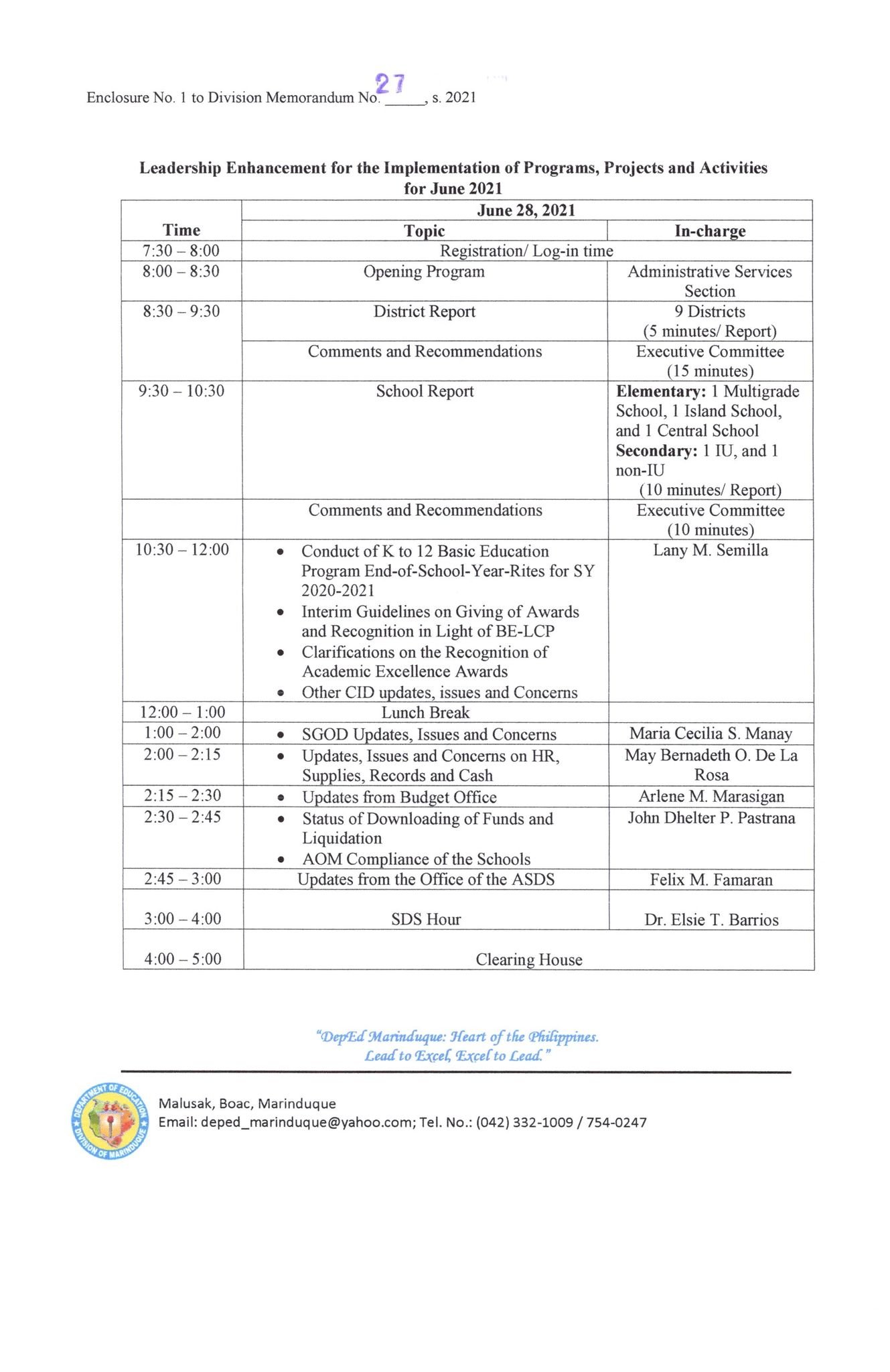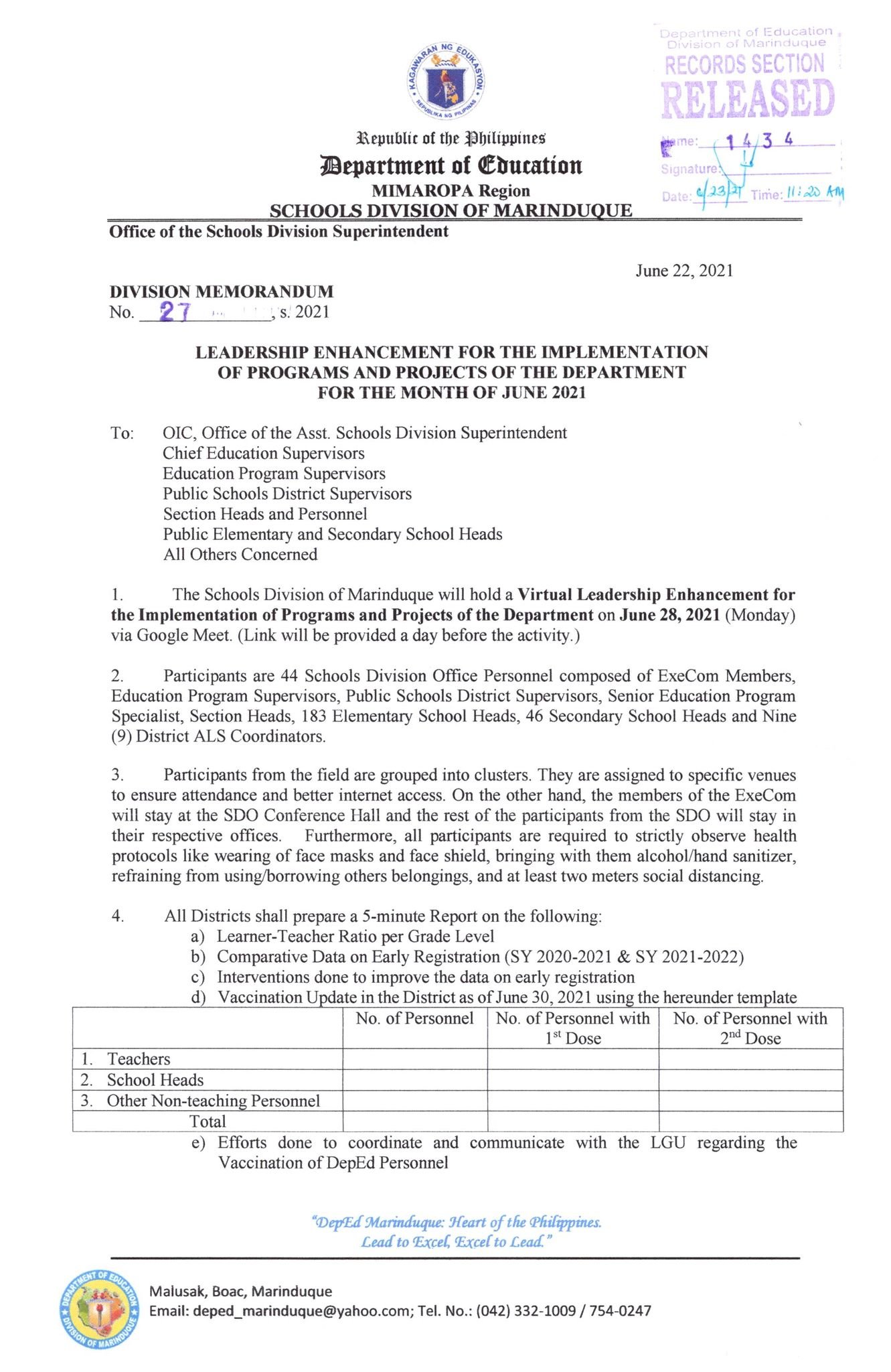 Jun 23, 2021 DIVISION MEMORANDUM NO. 27, S. 2021 LEADERSHIP ENHANCEMENT FOR THE IMPLEMENTATION OF OF PROGRAMS AND PROJECTS OF THE DEPARTMENT FOR THE MONTH OF JUNE 2021