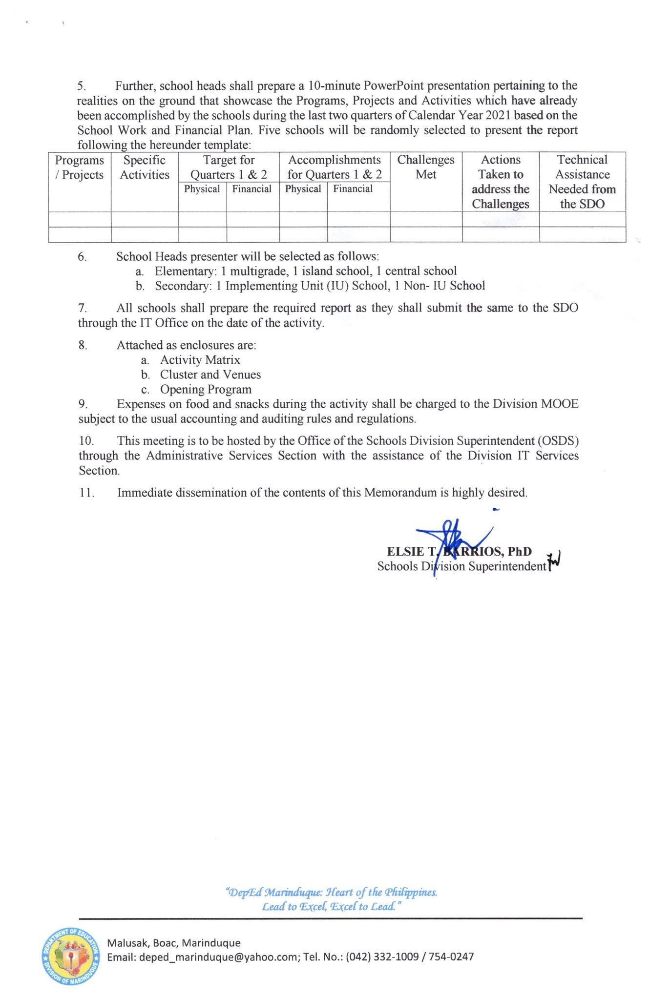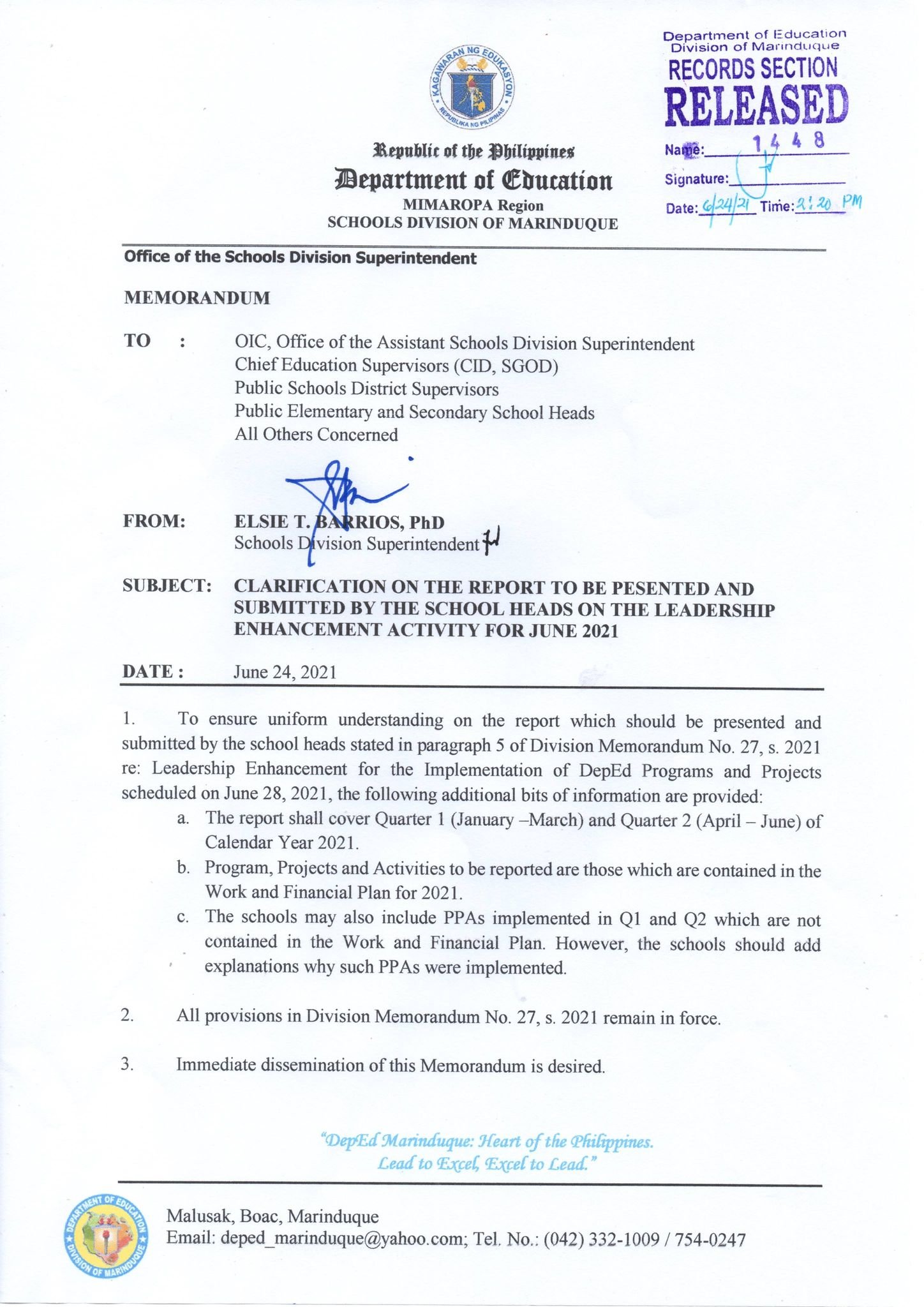 Jun 24, 2021 CLARIFICATION ON THE REPORT TO BE PRESENTED AND SUBMITTED BY THE SCHOOL HEADS ON THE LEADERSHIP ENHANCEMENT ACTIVITY FOR JUNE 2021