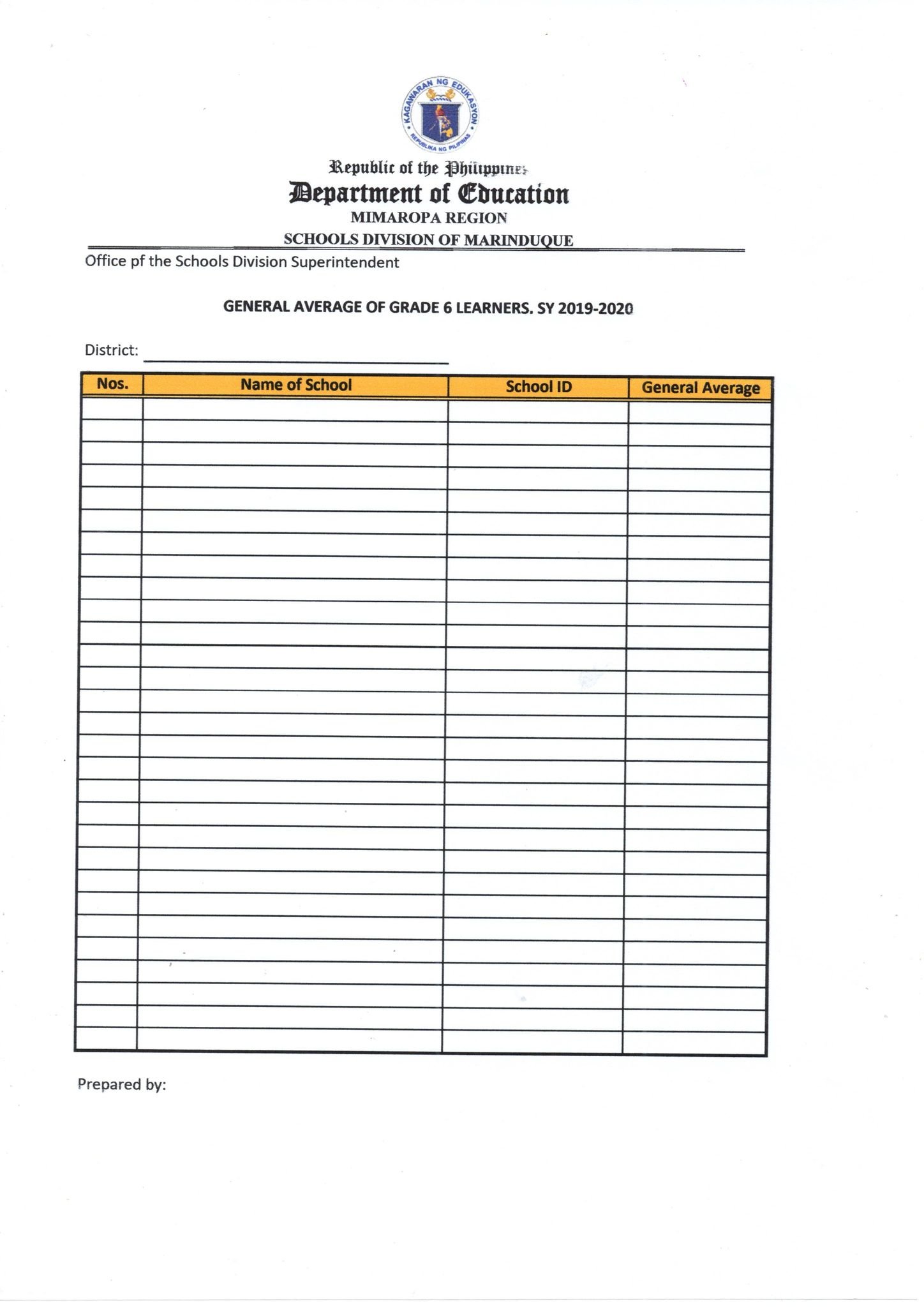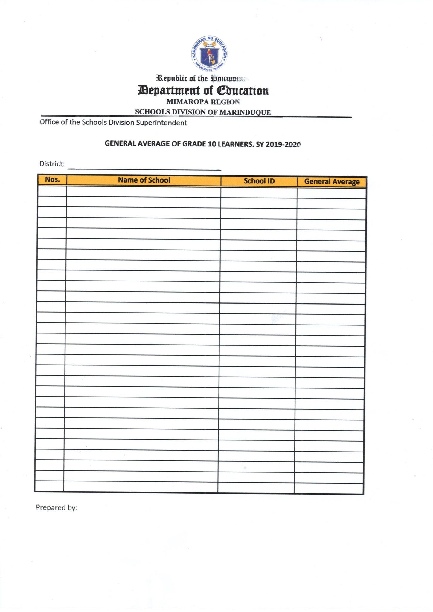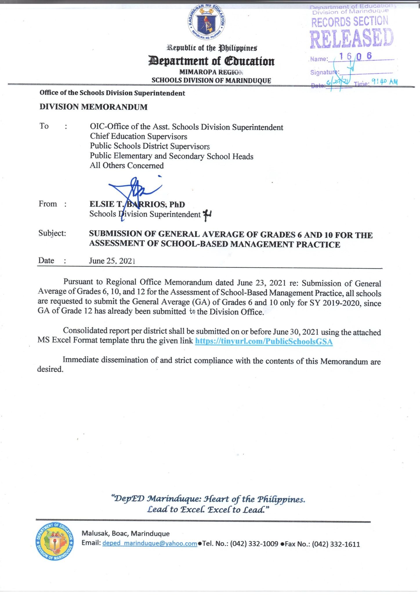 Jun 29, 2021 SUBMISSION OF GENERAL AVERAGE OF GRADES 6 AND 10 FOR THE ASSESSMENT OF SCHOOL-BASED MANAGEMENT PRACTICE