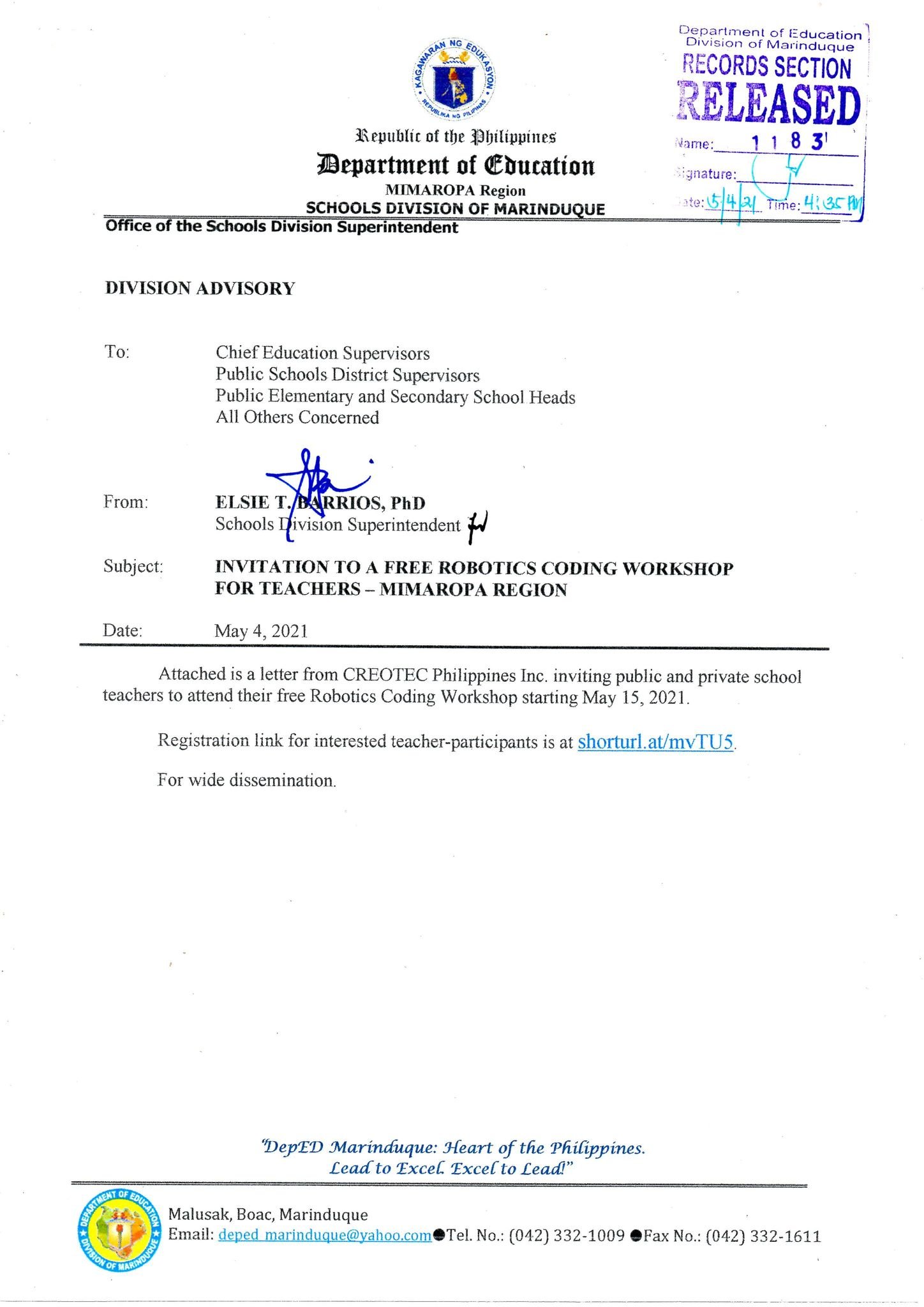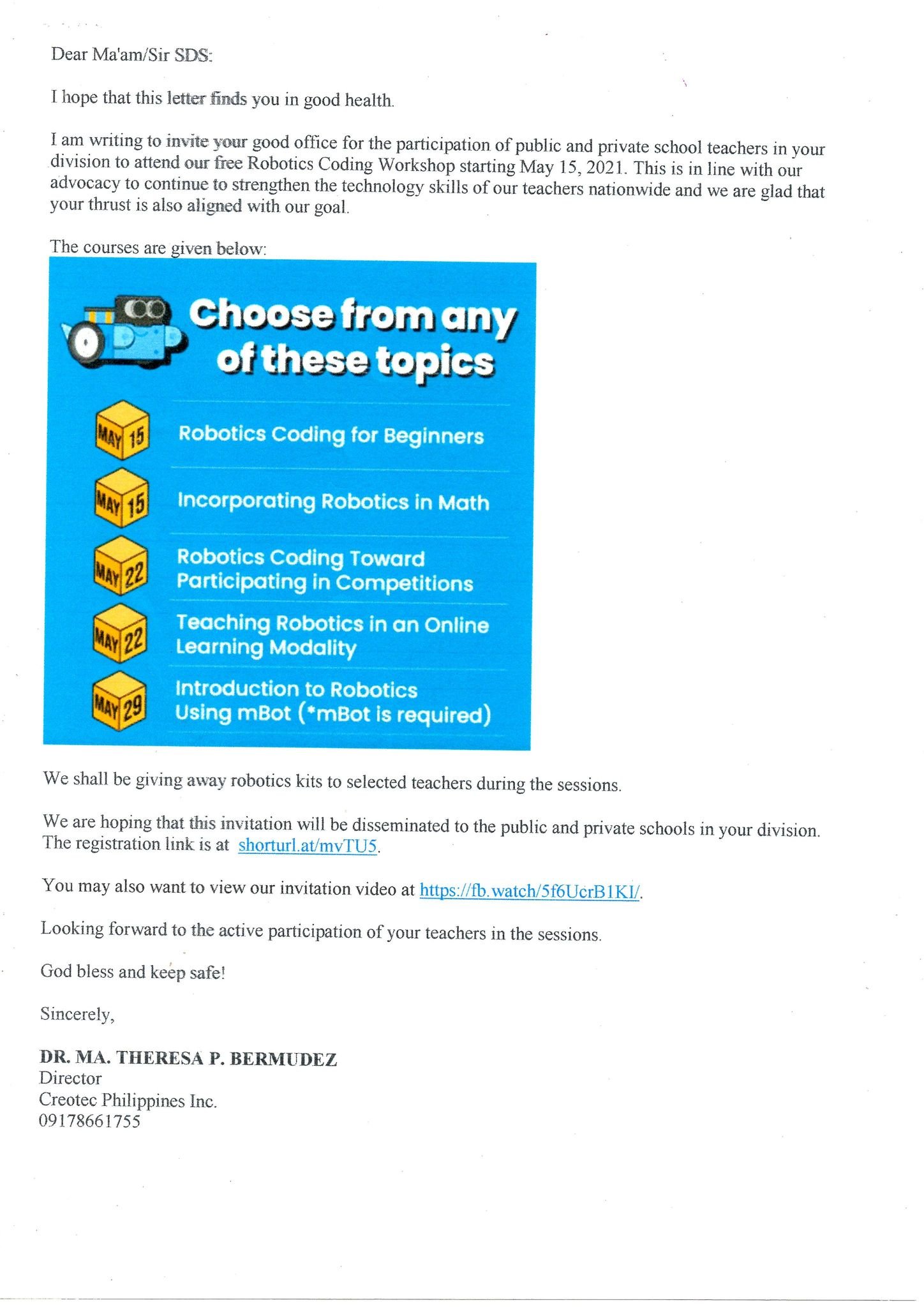 May 05, 2021 INVITATION TO A FREE ROBOTICS CODING WORKSHOP FOR TEACHERS-MIMAROPA REGION