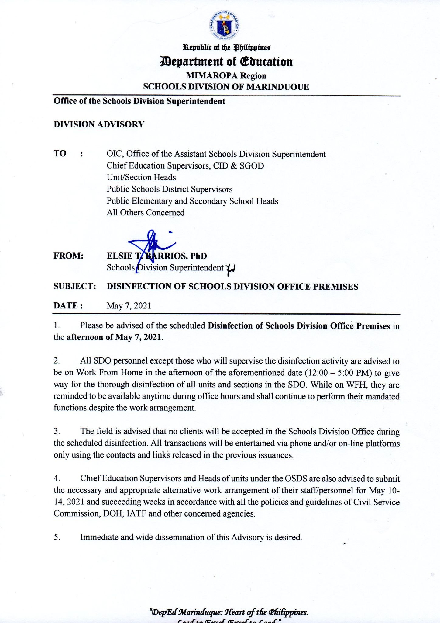 May 07, 2021 DISINFECTION OF SCHOOLS DIVISION OFFICE PREMISES