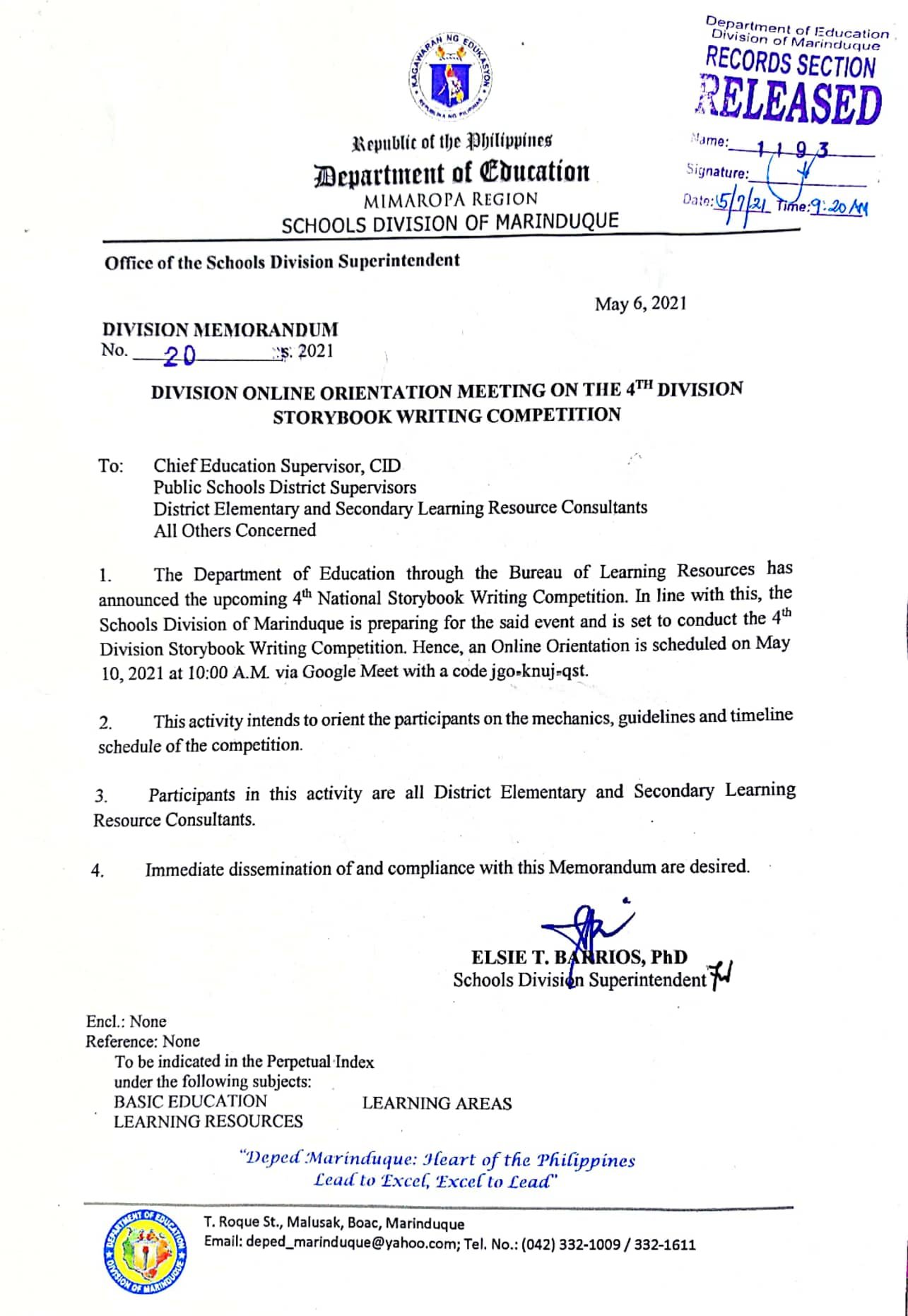 May 07, 2021 DIVISION ONLINE ORIENTATION MEETING ON THE 4TH DIVISION STORYBOOK WRITING COMPETITION