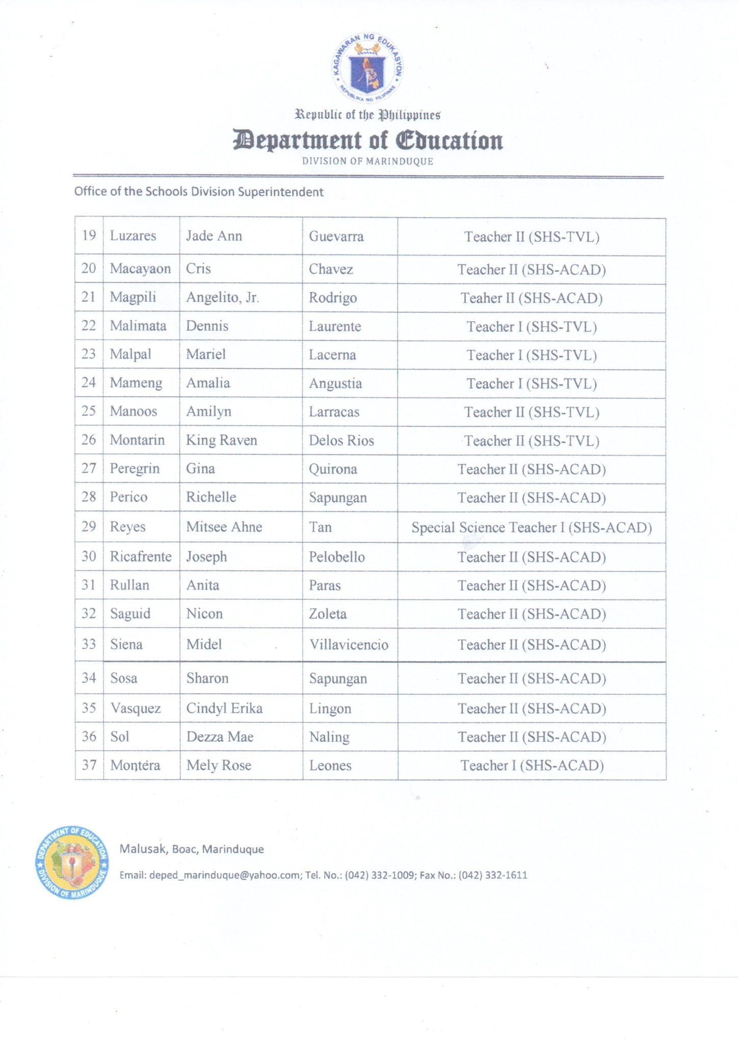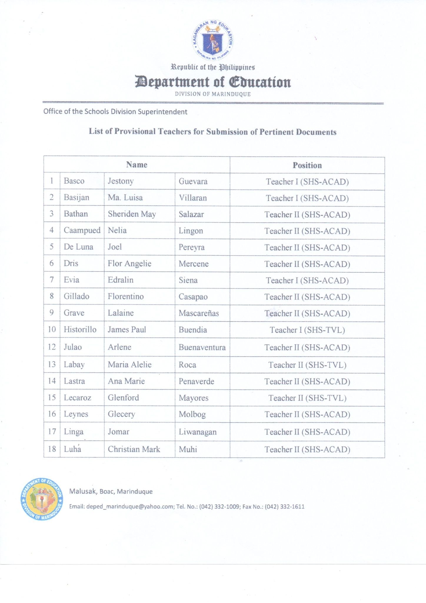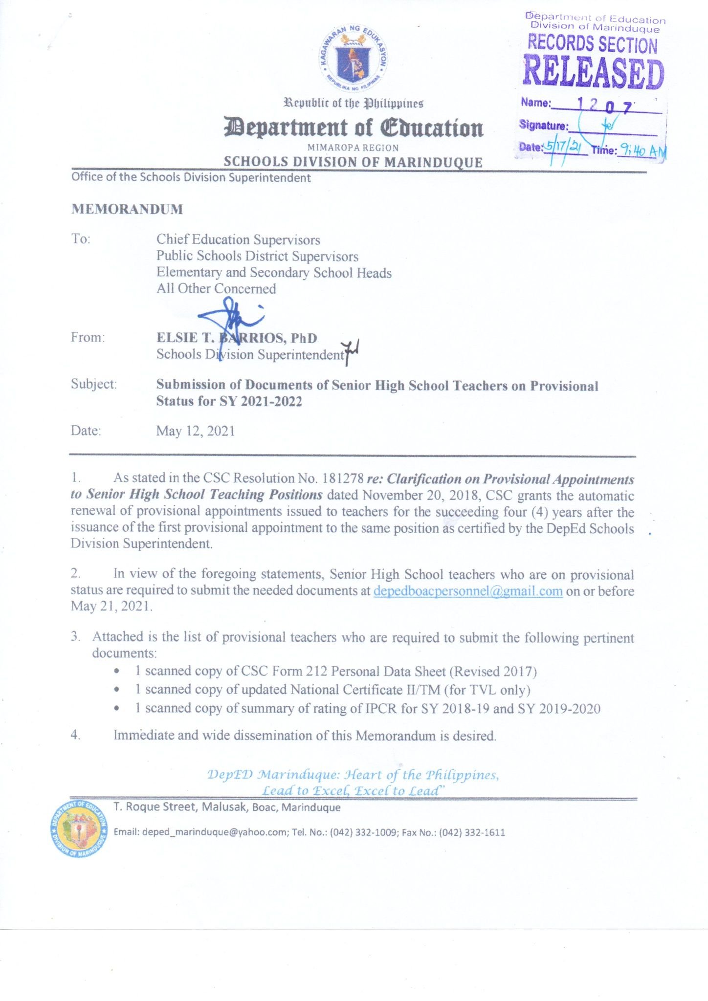 May 17, 2021 SUBMISSION OF DOCUMENTS OF SENIOR HIGH SCHOOL TEACHERS ON PROVISIONAL STATUS FOR SY 2021-2022
