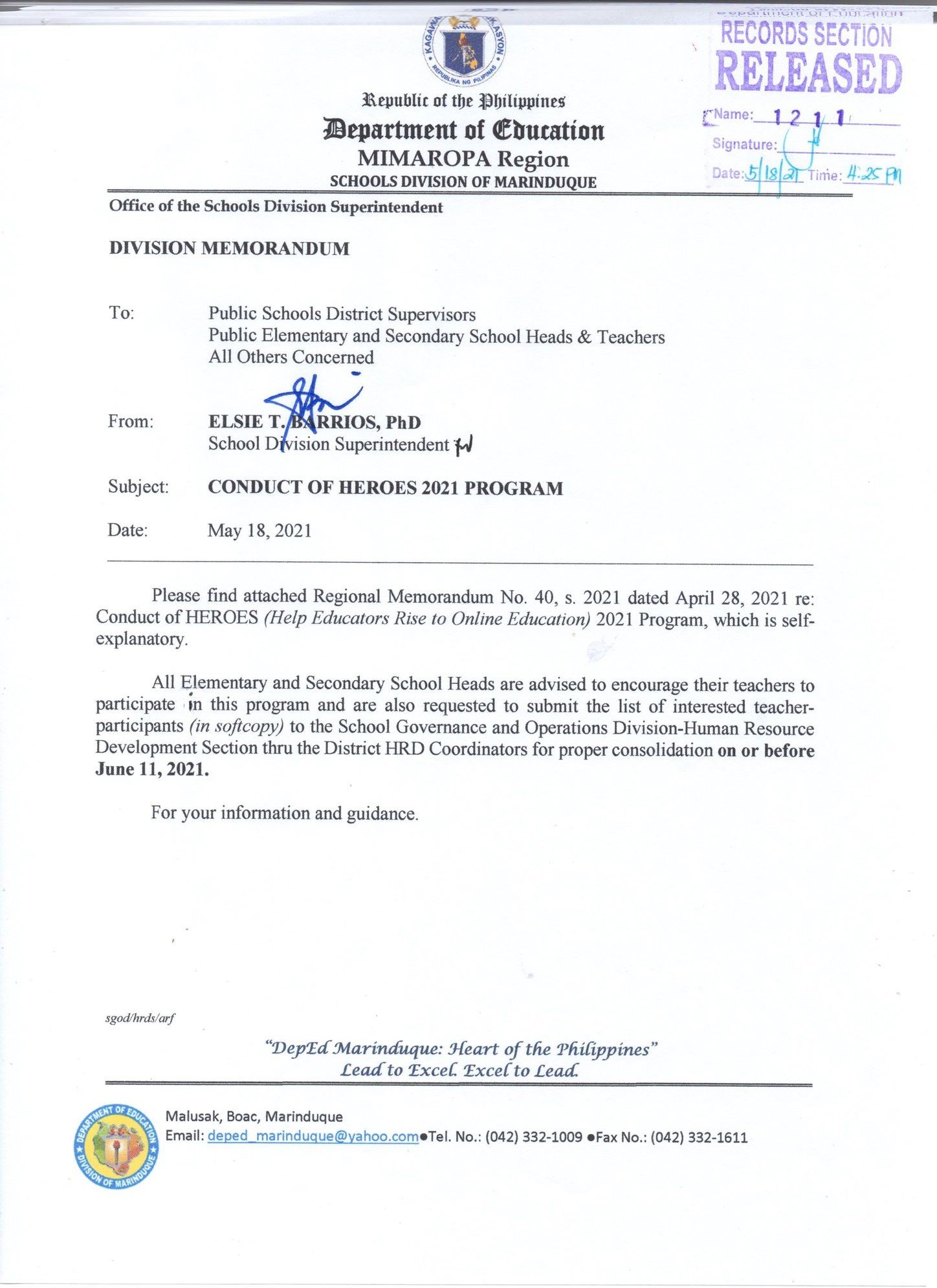 May 19, 2021 CONDUCT OF HEROES 2021 PROGRAM